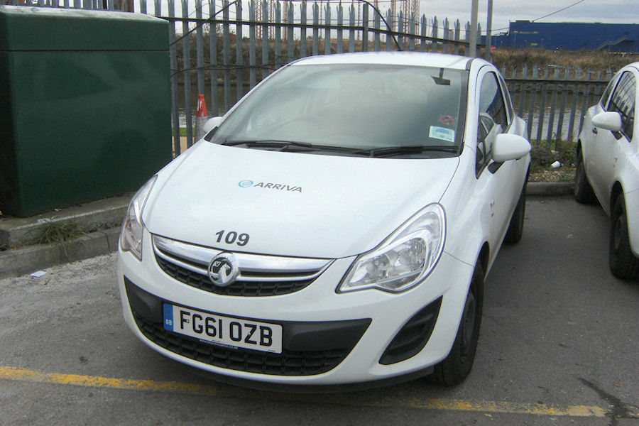 Details: Yet more Vauxhall Corsa cars were delivered to Arriva London starting in December 2011, these to replace the late-2008/early-2009 batch of cars numbered in the 107 to 135 range. Once again the fleetnumbers were reused, but the new cars were this time white instead of silver. The first to be reported was 109, photographed (with permission) at Edmonton Garage on 9th January 2012. |