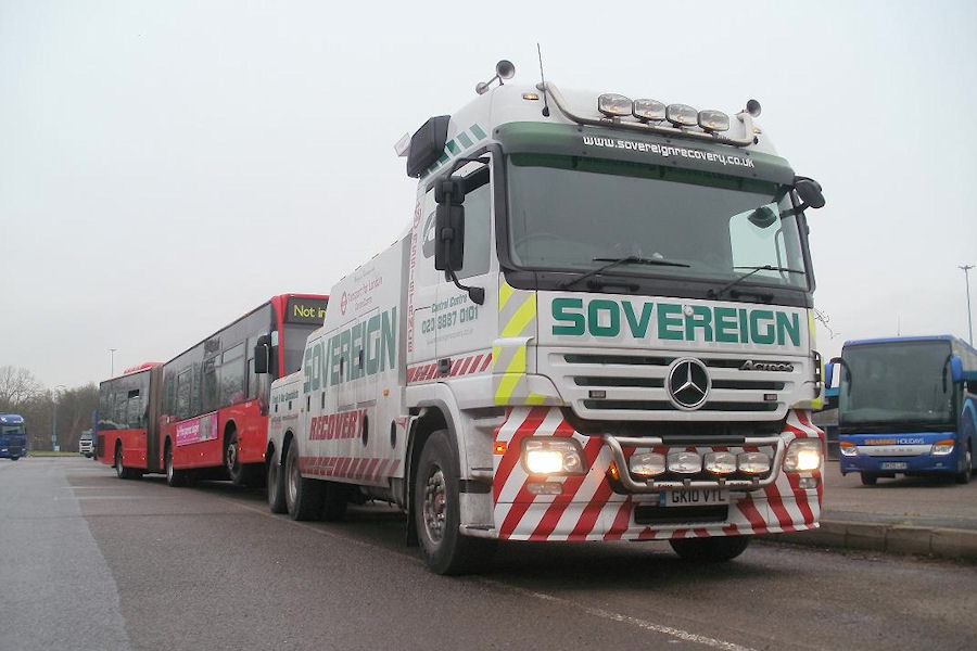 Details: Making its fifth appearance on this site, this photo of Sovereign Recovery's Mercedes Actros GK10VTL has been included as it may be the last time a bendy-bus features here. It was found at London Gateway Services on the M1 motorway on 19th December 2011, with First London EA11041 on tow. The bus was one of the batch used on route 207, the last to be converted (on 10th December). |