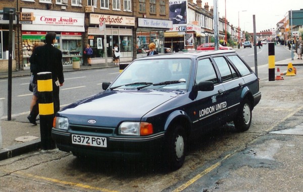 Details: Parked in the bus station at Hounslow on 18/9/91, this Ford Escort Estate carries London United markings on a non-standard dark-blue livery. |