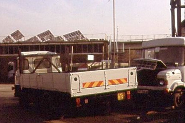 Details: Another interesting photograph of Chiswick Works, taken on 10th November 1983. The main subject is Leyland Terrier dropside lorry 2213L, one of four delivered as refrigerated food vans in 1979. I have never seen a photo of one of these in their original condition but they probably looked rather like 2143L. They were based at the LT Food Production Centre in Croydon until its closure in July 1983. Three of the vans were sold later in 1983, while 2213L was rebuilt as a dropside lorry and saw a few more years use. Incidentally, 2143L was also rebuilt, becoming a curtain-sider. The van on the right is Ford A0609 prototype 2062F, out of use and soon to be sold. |