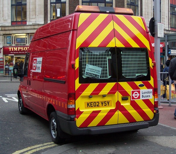 Details: The height of the high-roof Ford Transit van is particularly noticeable from the rear, especially when high-visibility chevrons are applied as seen in this view of 5301F (KE02YSY) at Victoria in spring 2004. |