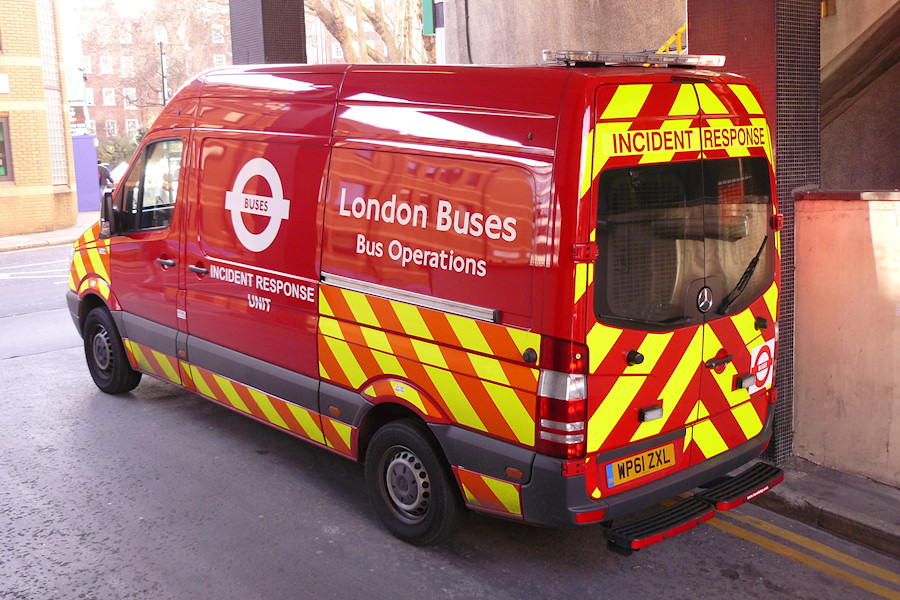 Details: The latest batch of Incident Response Unit vans for London Buses are indistinguishable from the earlier ones. 7302M was photographed on the ramp at Victoria Coach Station on 25th February 2012. |