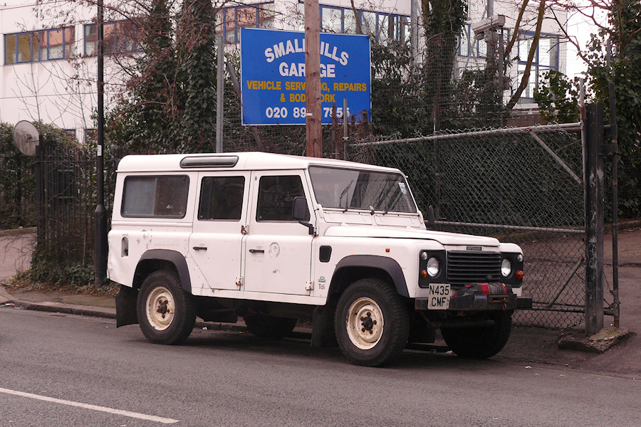 Details: Apart from communications truck 2488M (and various trailers and cranes), the oldest active vehicle in the central fleet is Land Rover Defender N435CMF. New in 1996 as a British Transport Police vehicle, it has been with Tube Lines since at least 2004. It is based at Acton Works and is only rarely seen on the road. On 24th February 2012 it was found parked outside Smallbills Garage on Bollo Lane. Since last illustrated, the Tube Lines logos have been removed. The winch on the front bumper was fitted from new. |