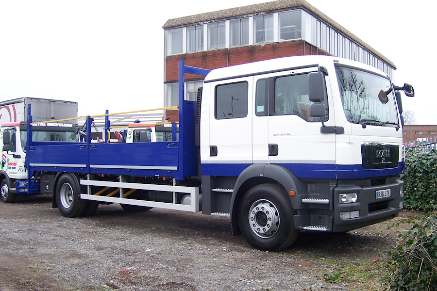 Details: A second new MAN TGM dropside lorry had joined RJ61LTF at the Stanwell Road MAN dealership by 23rd February 2012. RJ61LTE was photographed on the 29th, and was still there, unlicensed, a week later, suggesting that the 61 registrations may be voided and replaced with 12 ones. This view shows the bodywork more clearly, and also the silver reflective stripe on the lower cab sides. |