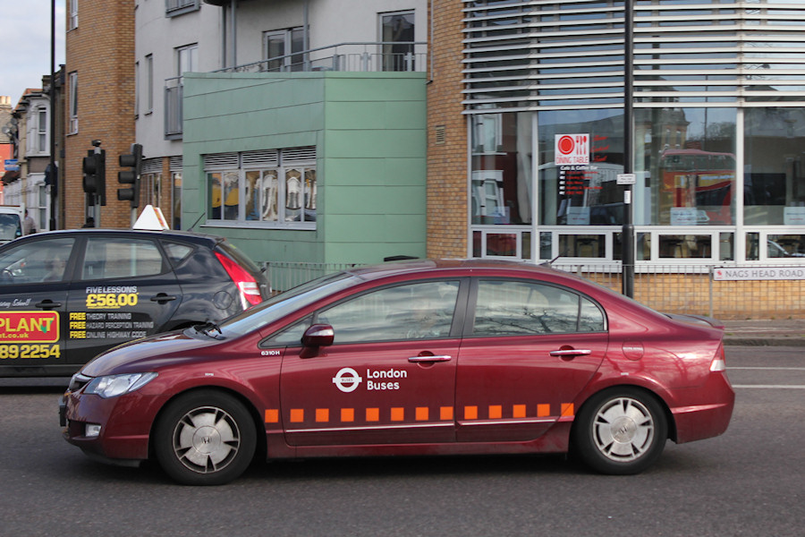 Details: This may be the last remaining Honda Civic in London Buses use. Sixteen such cars were leased in Summer 2007, fifteen carrying this Maroon with orange squares livery and the sixteenth in unmarked dark blue. Most were withdrawn in late 2011, although one or two briefly saw some further use with LUL at Acton. 6310H spent its first four years based at Eltham Bus Station but was then transferred north in early 2012. It was photographed passing through Ponders End on 25th February 2012, suggesting that it was then based at Waltham Cross. Similar 6305H may still be in stock but has not been reported since September 2011. |