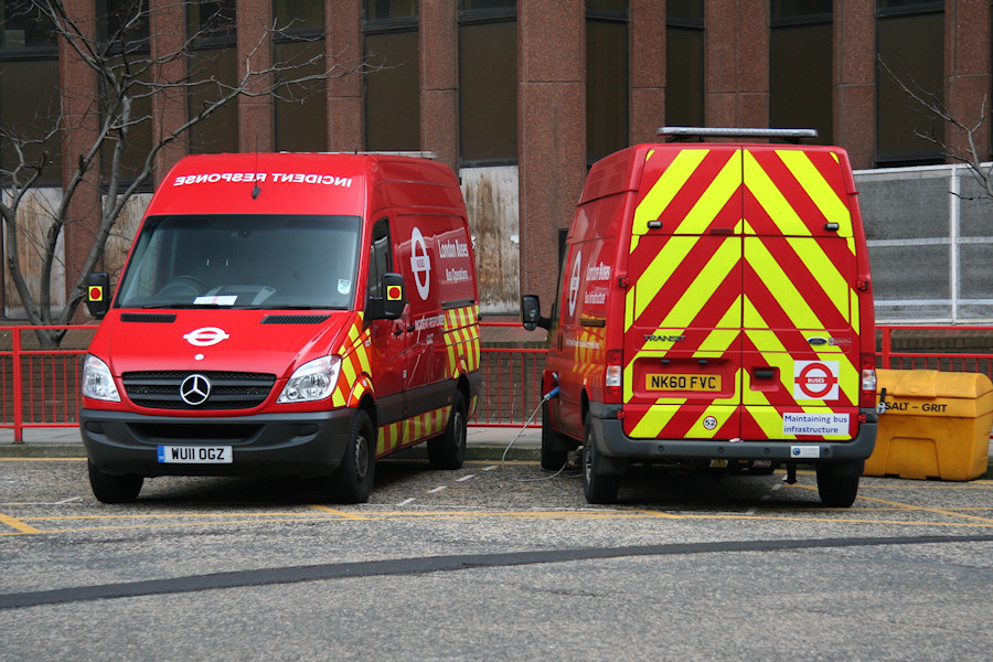 Details: A colourful pair of vans photographed at Aldgate Bus Station on 13th March 2012. Mercedes-Benz Sprinter 7010M on the left is an Incident Response Unit van that started out working from Victoria. Ford Transit 7160F on the right is one of the four Smiths electric van conversions operated by Bus Infrastructure. Note that 7160F is plugged in to the electric supply. |