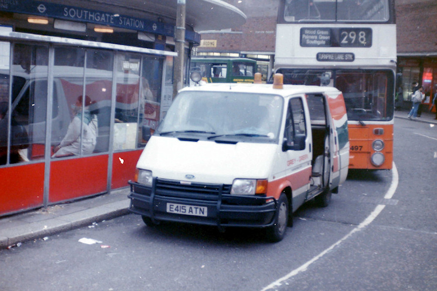 Details: Another Grey Green picture from Richard Eversden, this one taken at Southgate Station in 1990. Ford Transit van E415ATN carries the coach livery of white with orange and green stripes turning into flags towards the rear. First licensed in 1987, it was probably with Grey Green from new, although it later passed to Arriva London and was withdrawn in about 2001. The van was photographed attending to bus 497, one of twelve Northern Counties-bodied Daimler Fleetlines acquired from Greater Manchester PTE in 1987. The Grey Green bus livery at the time was white with orange lower parts and brown uppers, i.e. no grey and no green! |