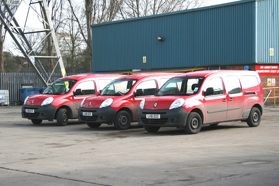 Details: Plough Lane Garage's three Renault Kangoo Maxi crew vans were photographed lined-up at home on 16th February 2012. Delivered the previous October to replace the last of the former East Thames Buses crew ferry minibuses, the trio remained in anonymous (and dirty) red livery. |