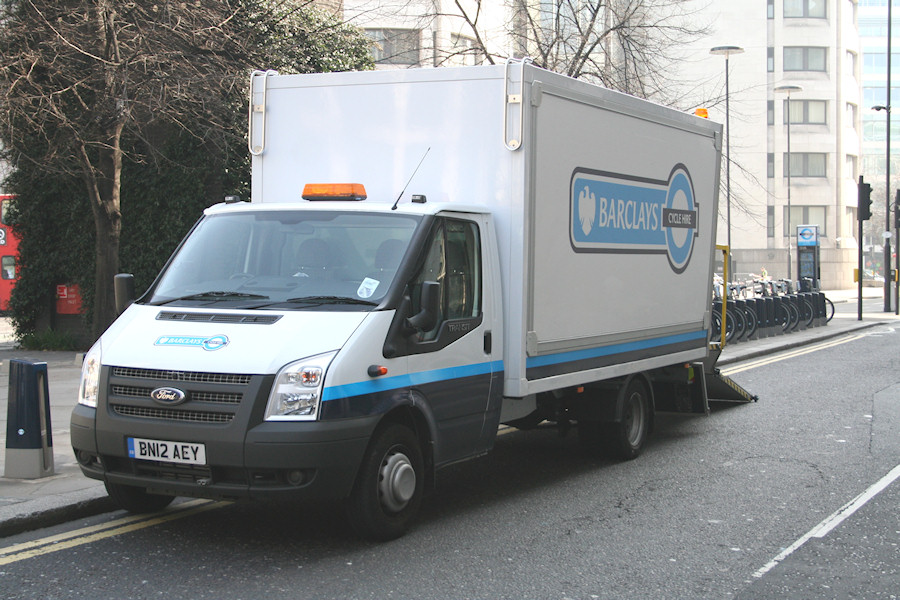 Details: The last two pictures today show a recent addition to the Barclays/TfL cycle hire support fleet. Photographed at St Pauls on 24th March 2012, BN12AEY is a Ford Transit box van with some unusual features. The box body has tree deflectors at the top corners, and huge logos on the sides. Most strange however is the sloped rear, seen more clearly in the next picture. Note that unlike previous vehicles with this operation, no fleetnumbers were apparent. |