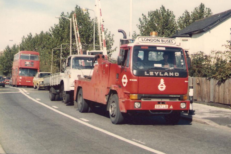 Details: A lucky catch on Bollo Lane on 11th October 1984 was this view of Leyland Freighter recovery truck 2372L towing Ford D0607 dropside lorry 1983F. 2372L spent its first 8 or 9 years based at Cricklewood Garage, as evidenced by the Cardinal District sticker on the front (Cricklewood was reassigned from Watling District in the reorganisation of January 1984). Ironically 2372L was later reallocated to Acton Works and repainted white/blue for a new role as a service vehicle recovery truck. The Ford lorry, allocated to Holloway Garage, still has the framework for its tilt cover. It is a pity that this vehicle was not selected along with RM1983 and T1983 (aka T747) for repainting in gold livery for LT's 50th anniversary in 1983. Bringing up the rear is trainer bus DM1909. |