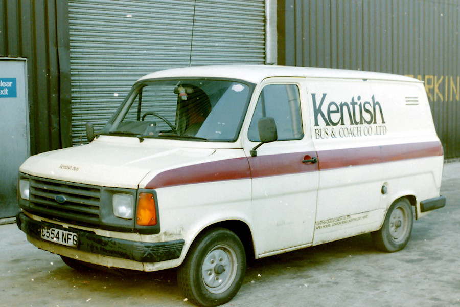 Details: Ford Transit Mk2 van C554NFG was new to London Country in September 1985, carrying green livery and the fleetnumber 71F. When LCBS was split-up in 1986, 71F passed first to London Country South West before moving to London Country South East. That company was renamed Kentishbus in 1987 and also introduced a new livery and fleetnumbering scheme. 71F became 926 (although the number is not visible in this view taken at an unknown location) and was repainted cream with a maroon stripe. It is not known how long the van remained in use, but it was last licensed in 1997. |