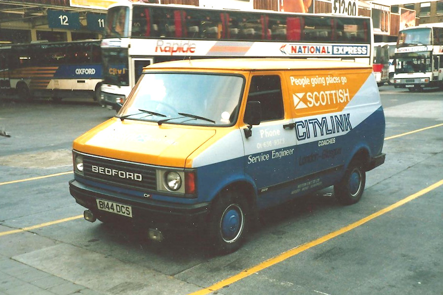 Details: Photographed a very long way from home, Bedford CF van B144DCS was at Victoria Coach Station on an unrecorded date in the late 1980s/early 1990s. Carrying Scottish Citylink livery, the van belonged to Western SMT. Its presence was probably due to the reliability problems experienced with the MCW Metroliner double-deck coaches used on the London to Scotland services. Given that the phone-number on the door of this van has an 01 prefix, it is likely that it was in fact outstationed to London. In the background are several Plaxton Paramount coaches, including two of the less common '4000' double-deck variant. |