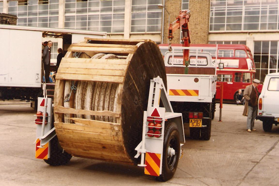 Details: During the open day at Chiswick Works on 11th August 1985, Leyland Freighter lorry 2397L was again part of the vehicle display. As in the previous year, its crane was deployed, but this time the stabiliser legs were also extended. Not apparent in this rear view is the fact that it had also gained the twin pin-striped livery variation (as seen on Bedford 2275B). The trailer is SEB cable-drum carrier SEBT42 (lettered as SEB-T-42), new earlier in the year. On the left is Bedford TL box lorry 2318B with its sliding doors open and steps arranged to allow visitors to walk through it. |