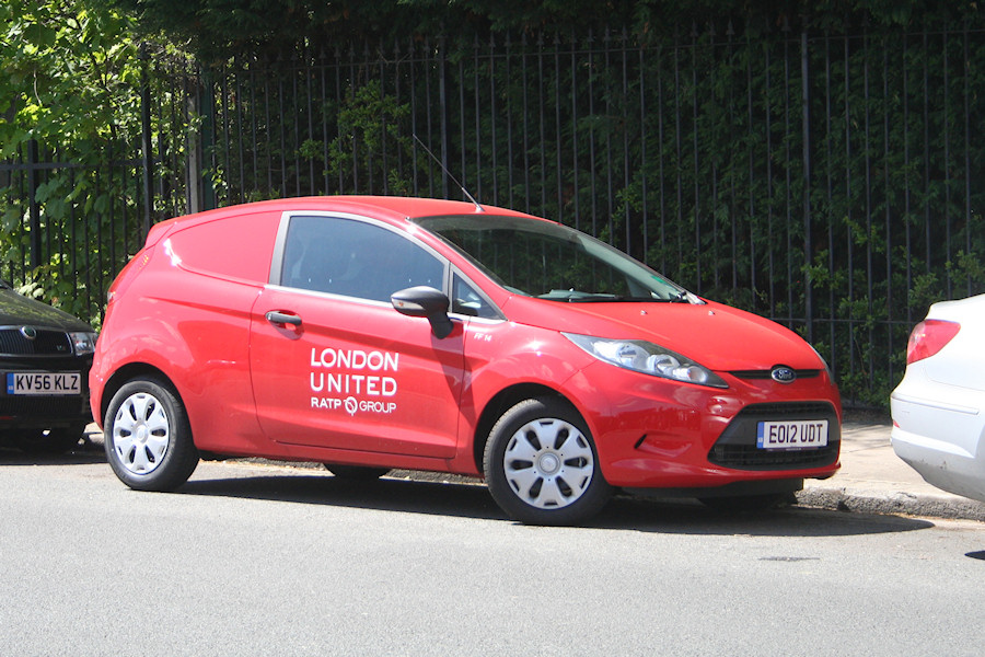 Details: To call the event held at Fulwell Bus Garage on 12th May 2012 (for the 50th anniversary of the Trolleybus closure) an open day would be a bit generous. Most of the front yard was roped off and used for the display of several buses and trolleybuses (and 89Q), but the garage itself was out of bounds. However, the event did draw huge crowds and the weather was pleasant. London United had recently taken delivery of a large fleet of new service vehicles but none of these was on display. Two could be glimpsed (just) within the garage, while a third was more visible, parked on Wellington Road opposite the garage. Numbered FF14, this Ford Fiesta van is reportedly allocated to the former NCP/NSL garage at Twickenham. |