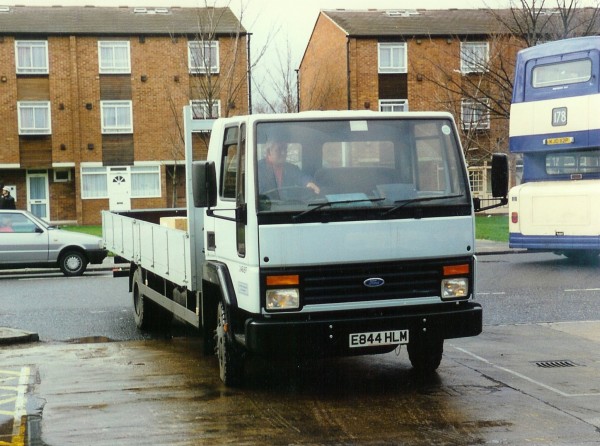 Details: A batch of 4 Ford Cargo 0811 Dropside Lorries was bought in 1988, these being identifiable by having smaller wheels and narrower mudguards than the heavier 1011, 1313 and 1613 models. The batch spent much of their early lives based at bus garages. In the case of 2468F (E844HLM), photographed arriving at Bexleyheath garage on 28th March 1988, Catford garage was home. Bexleyheath had recently reopened as the base for the low-cost Bexleybus unit, one of whose rejuvenated DMS buses is seen departing in the background. The cream and blue livery was also carried by a handful of service vehicles, including 3353F. |