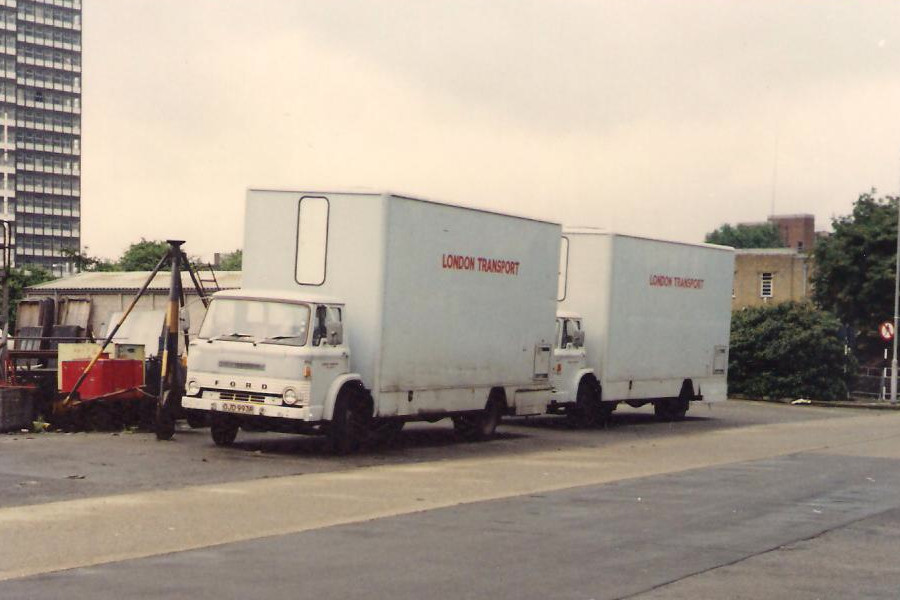 Details: This photograph was taken at the Chiswick Works open day on 11th August 1985 and shows two of the distinctive Ford D-series uniform issue units parked up. 1993F is to the fore, with 1947F behind. Also visible are that curious tripod thing and bits of two sweepers, as also seen here. More SVs were parked further left, as seen here. |