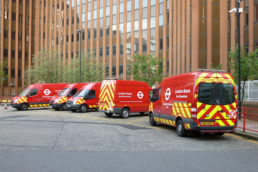 Details: Mercedes-Benz Sprinter vans 7002M, 7009M and 7010M are seen at their home base of Aldgate Bus Station on 12th May 2012. All have been shown on this site before. However, this view is the first to show both types of 'green' red Ford Transit together. Nose out is Ashwoods hybrid 6986F, part of the operations fleet and therefore in the same livery as the Mercedes vans. This and sister 6985F have been moving around various locations since delivery in late 2010, presumably to test their accumulator power packs under various conditions. Next to 6986F, and nose-in as usual, is Smith electric conversion 7160F, used by LBSL Infrastructure and carrying the orange squares livery. |