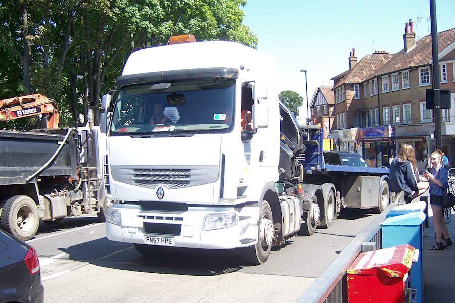 Details: Tube Lines has taken delivery of two new Mercedes-Benz Actros artic tractors this year, but still has need to sometimes hire additional units. Photographed passing Acton Town station on 23rd July 2012, this Renault Premium has a sleeper cab and a large crane. Although barely visible in the sunshine, a Tube Lines label had been applied behind the cab door. The short flatbed trailer looks to be in LUL blue but its appearance does not match any of the known fleet members. It may also have been hired. Ray gets extra points for another 'SV plus girl/s' shot. |