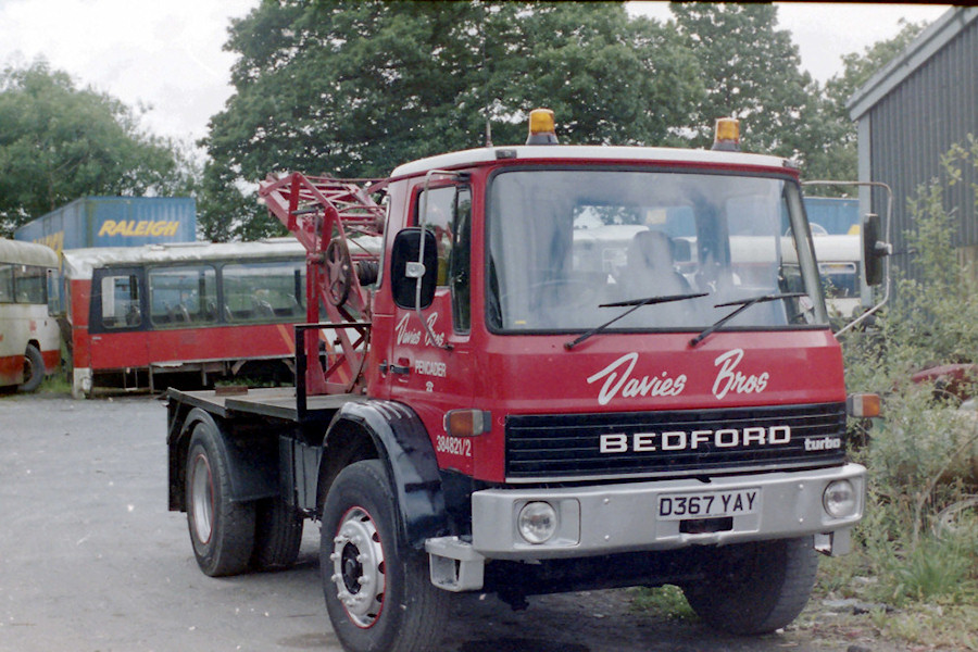 Details: Davies Bros of Pencader was a traditional independent operator in South Wales, eventually taken over by SWT (South Wales Transport, now part of First). Photographed at their garage at about the time of the takeover, D367YAY was a recovery vehicle based on a very late model Bedford TL truck. The lifting gear looks rather antiquated. Note also the stripped down bus in the background. |