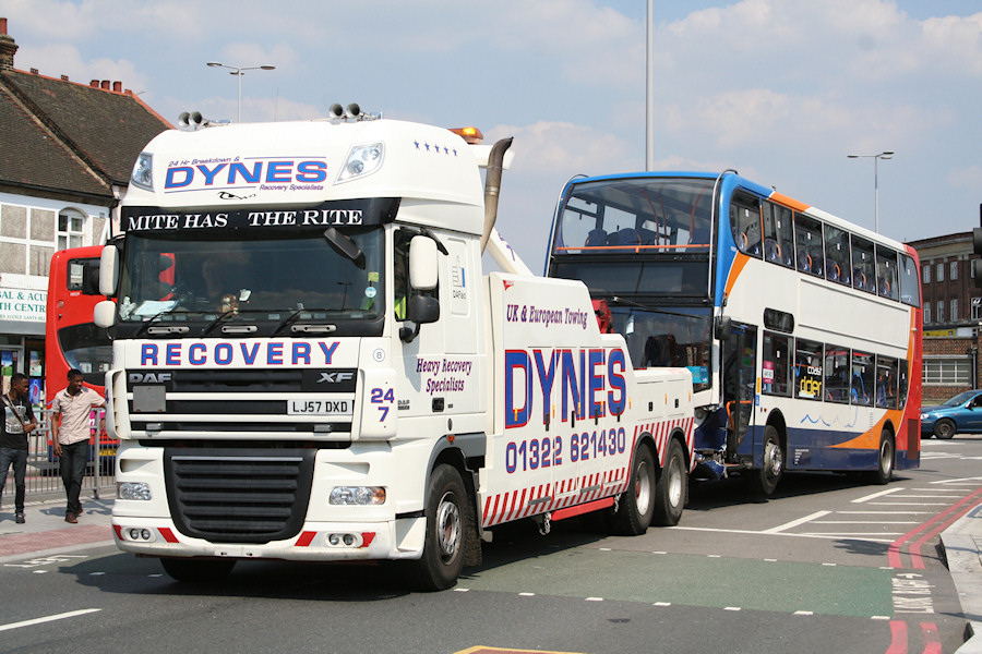 Details: The main happening in London in summer 2012 has of course been the Olympic and Paralympic games. For transport enthusiasts this has brought a lot of interest due to the several hundred additional buses drafted in to work services for athletes and spectators. One bus that won't have seen much action is Stagecoach Enviro 400 19376 (SV58BNA), damaged before the games even started. On 25th July it was photographed being towed through Gants Hill by Dynes Recovery DAF XF fleetnumber 8 (LJ57DXD). Note the rather awful slogan on the sun-visor. |
