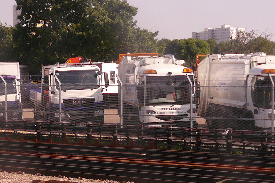 Details: MAN 3-axle lorry RV12OFK was delivered in May 2012 but has yet to be photographed on the road. It is visible on the left in this view of Acton Works' Lorry Yard taken on 11th August 2012. Also apparent are 2 of the 8 hired full-sized dustcarts present at the time. Both were Dennis Elite vehicles in white livery, the one in the centre having Collett Transport Services lettering. As can be seen, the hired vehicles all had Tube Lines labels applied on the cabs (small) and bodysides (large). It is presumed that they were taken on hire to cover extra requirements during the Olympic games. |