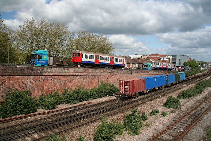 Details: With deliveries of the 58 8-car trains of S stock for the Metropolitan line now complete, the last few units of A stock are confined to a few peak hour services and contingency cover. Movements of cars for storage or scrapping has continued, mainly being loaded at Northwood Station sidings. As already shown, some units are being taken to Eastleigh works. On 16th May 2012 it was the turn of driving motor car 5093 and trailer 6093. They were photographed coming up to the overbridge (with its tricky s-bend), loaded onto Allelys DAF lorries W948RWP and T300AHH. Passing beneath is a container train formed of DB Schenker (formerly EWS) FCA type wagons. |