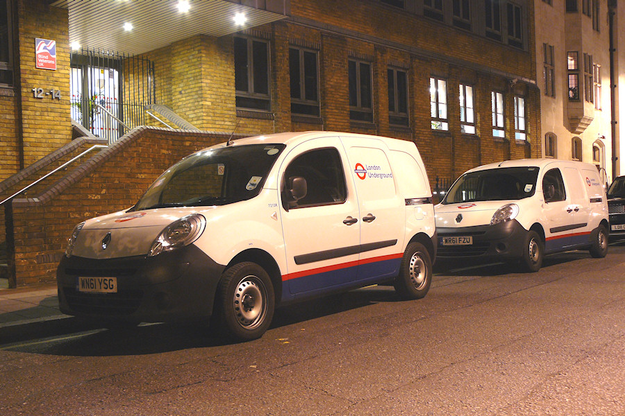 Details: The delivery of a large number of Renault Kangoos from late 2011 onwards included estate cars and long, medium and short length vans. The short vans, branded as Kangoo Compact, are the rarest and also the easiest to identify. However, I admit to having trouble sometimes telling the regular Kangoo from the Kangoo Maxi. This photograph, taken on Harcourt Street near Griffith House on 22nd August 2012, has helped. To the fore is 'regular' Kangoo 7215R, with the runner for the side cargo door extending to the rear of the bodywork. Behind is Kangoo Maxi 7214R, with a space beyond the end of the door runner, an elongated rear wheelarch shape, and a piece of black plastic applied to the skirt ahead of the rear wheel. |
