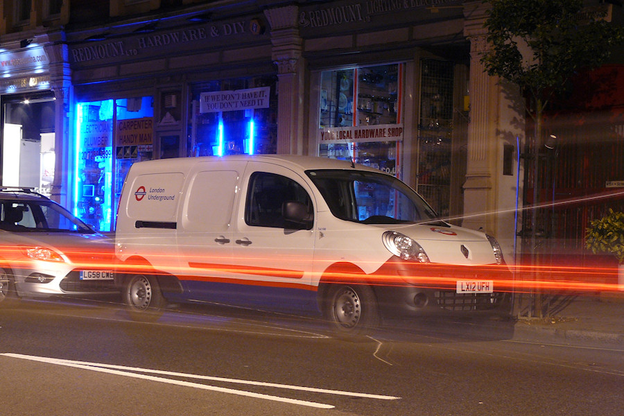 Details: Ah, the perils of night-time photography. On my recent trip I was generally using a 3.2 second exposure, with a 2 second shutter release delay added to avoid vibrations. When photographing across a road it was not always possible to predict whether any traffic would pass in front of your subject within those 5.2 seconds. This shot of Renault Kangoo Maxi van 7419R parked on Seymour Place (near Griffith House) was affected by a single car passing. I managed to re-do the shot, but I decided to use the first one as I thought it was more interesting. Note the black trim ahead of the rear wheel, and also the offside cargo door. Although it may not be a guaranteed recognition feature, all the Kangoo Maxi vans used as service vehicles seem to have cargo doors on both sides, while regular Kangoos have them on the nearside only. 22nd August 2012. |