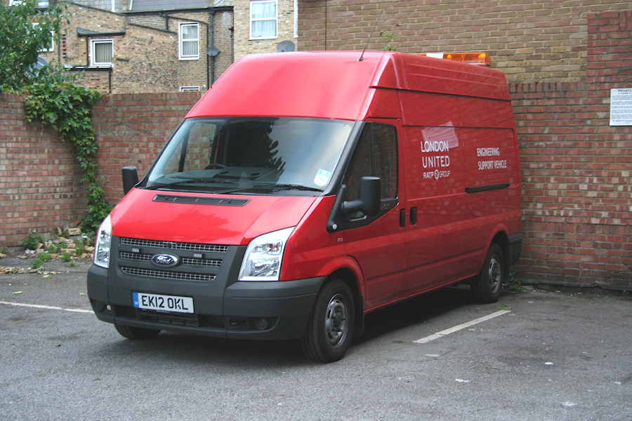 Details: We know that London United took nine new Ford Transit vans in May 2012 to renew their engineering fleet. We also obtained a list of the planned fleetnumbers and allocations but unfortunately these were changed before delivery. Only three of the vans have been reported so far, but that was enough to deduce that the fleetnumbers were actually applied in registration number order. Hence EK12OKL became FT4 at Shepherds Bush instead of FT7 at Stamford Brook. It was photographed in the garage car park on 30th June 2012. |