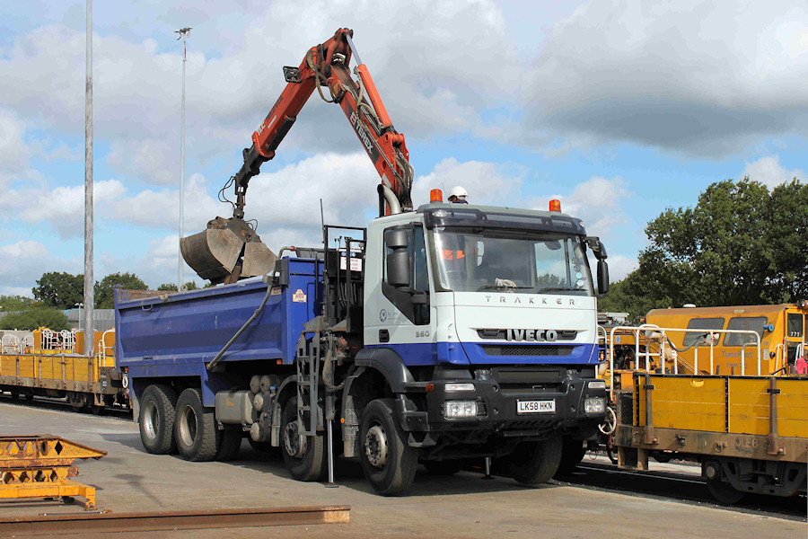 Details: Iveco Trakker tipper LK58HKN was on demonstration during an industry open day at Ruislip Depot on 11th September 2012. In this view it has its grab loading arm extended and stabilisers deployed (note that the front wheels are not on the ground). This view is very similar to one of its predecessor, Mercedes Actros 2578M at the same location about 10 years earlier. |