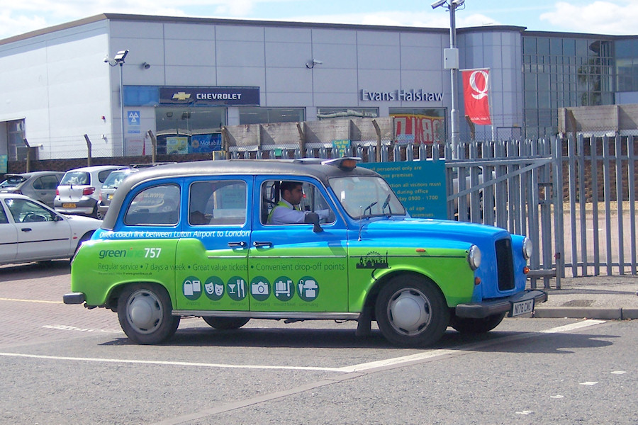 Details: Arriva the Shires has taken to using former London taxi cabs as crew ferry vehicles in a big way recently, with at least nineteen examples acquired in the past year. They are allocated fleetnumbers in the CFxx series started by Arriva Southern Counties (instead of the traditional Shires numerical series) but differ from the similar vehicles there in that they have all been repainted. CF87 (N176CMC) photographed at Luton Garage on 31st August 2012 is one of several to carry an unusual green and blue scheme with advertising for Green Line route 757. |