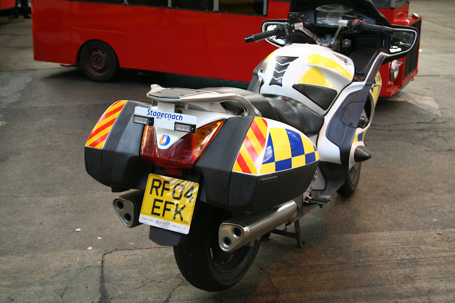 Details: Another view of Stagecoach Honda ST1300 motorcycle RF04EFK at the Leyton Garage open day on 22nd September 2012 shows the very neatly applied high-visibility markings, and also the small rear plate with Stagecoach name and lights. Three such motorcycles had recently been acquired by Stagecoach for use by the engineers at West Ham Garage. The plan is for these to provide a rapid response and assesment service to attend breakdowns and accidents involving buses. In the background is MRM1, a miniature double-deck bus owned by Ensign.