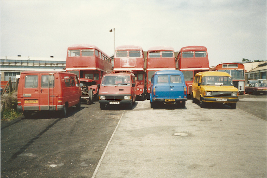 Details: Here's a very interesting photograph, taken in the staff bus yard at Chiswick Works on 19th May 1987. Visible are several RMA buses, seemingly out of use, along with some of the minibuses that replaced them. However, things get a bit complicated. According to the The London Bus Review 1987 (published by LOTS), Bus Engineering Ltd leased four Renault Trafic minibuses (C115/7/8/9UPK) in late 1986, these taking over certain staff bus duties from November (when Aldenham Works closed and Chiswick became the main centre of operations). Two second-hand Ford Transit minibuses were acquired in January 1987, followed by four new Freight-Rover Sherpa minibuses to replace the earlier Renaults. LOTS added that the Ford and Freight-Rover vehicles were allocated fleetnumbers 2458-2463 in November 1987, while the four Renaults (plus similar C116UPK) were temporarily re-hired to cover their 'absence' (unexplained). However, as this photo shows, C116UPK was on-site by May. Recently delivered 2460/1L were also present, though 2462/3L were yet to be delivered. Yellow Transit A289SHV (later 2459F) is carrying a destination board for Tring, one of the duties latterly performed by the Renaults. Finally, the identity of the Bristol/ECW single-decker on the left is not known, although the blind box layout suggests a bus of NBC origin rather than London Transport. |