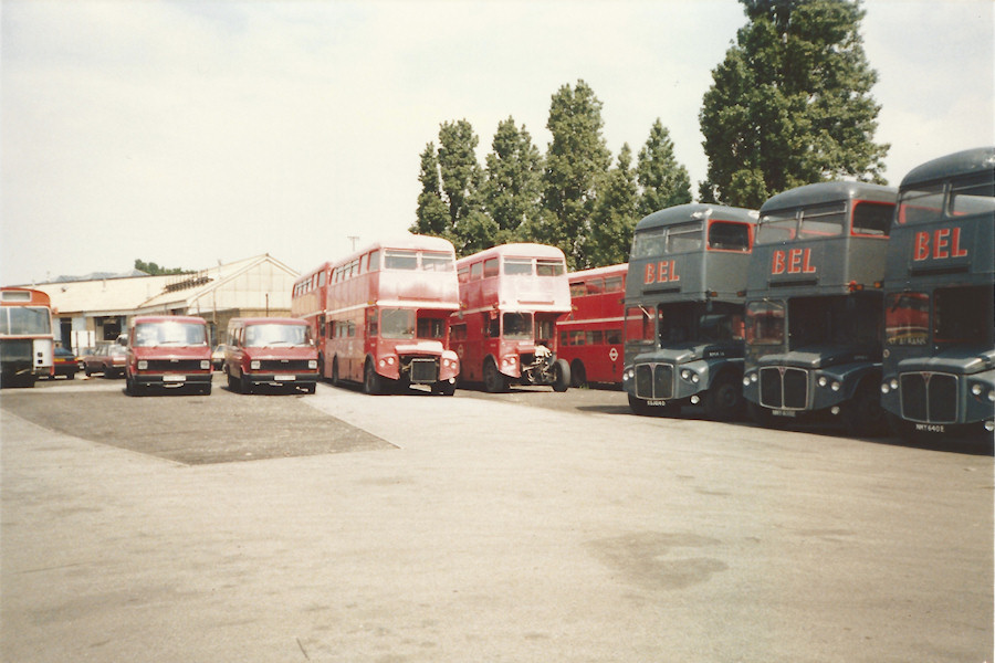 Details: Another part of the Bus Engineering Ltd (BEL) staff bus yard at Chiswick Works on 19th May 1987, with yet more RMA buses on show. The red examples in the background are obviously out of use, while on the right are three of the six that were repainted into grey/red livery in 1985/6. The two minibuses are Freight-Rover Sherpas D646/7YDP, later given fleetnumbers 2460/1L. The use of RMAs as staff buses finished in December 1987, while BEL was also sold off that month. The four Sherpa minibuses were leased to the new owners, although they appear to have returned to Distribution Services later on. |