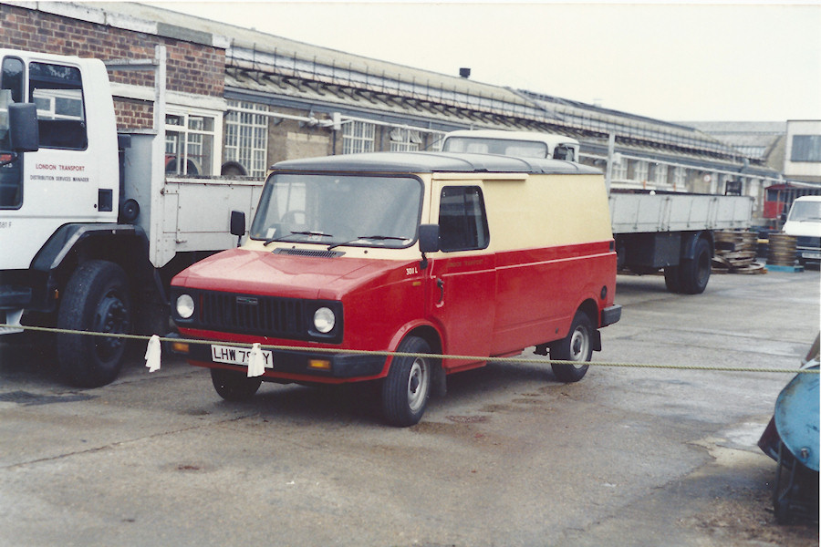 Details: An instantly recognisable service vehicle in the 1980s was Freight Rover Sherpa van 3011L. Delivered in grey livery, it was later repainted into a 'heritage' style comprising red and cream with a black roof. Used by the London Transport Museum, it was photographed at Acton Works on 11th August 1985 during an open day. Parked alongside was Ford Cargo lorry 2381F, with Leyland Boxer 2302L behind. However, perhaps of most interest (to me at least!) is the white van in the far background. This is the only known photo of 3333I, one of two Fiat Ducato vans new in 1985 as the first imported vehicles in the leased fleet. Both were allocated to Chiswick Works and lasted only around 2 years. The I fleetnumber suffix (F was not used for obvious reasons) did not reappear until 2003. |