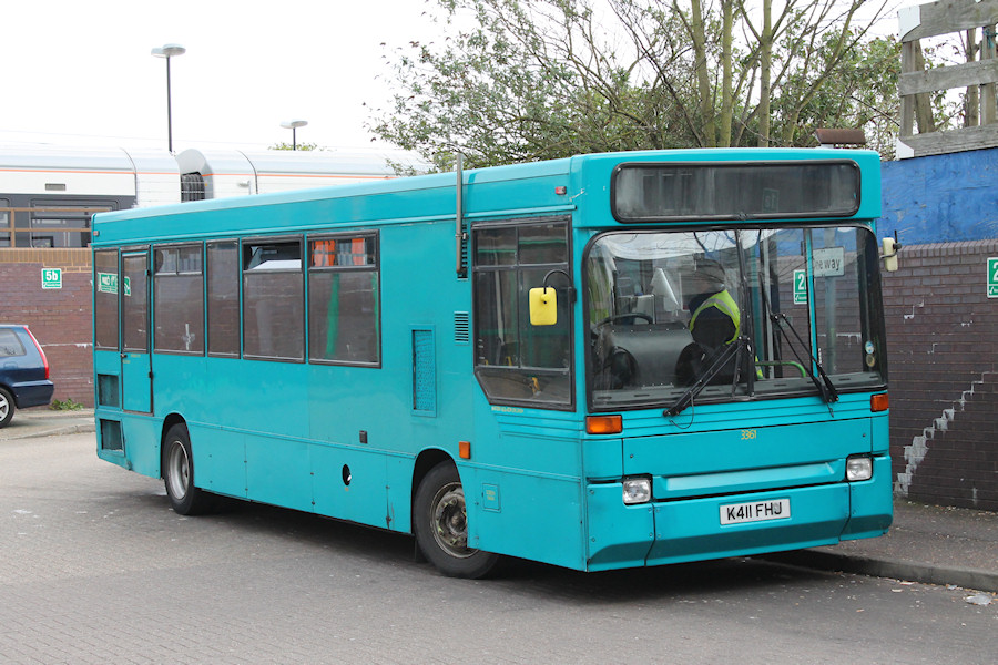 Details: Plaxton Pointer-bodied Dennis Dart K411FHJ was new as County Bus and Coach DPL411 in March 1993. The various re-organisations that affected the former LCBS operators saw it wind up as fleetnumber 3361 in the Arriva the Shires fleet. Replaced by low-floor buses, it was taken out of use in 2007 and modified to serve as a mobile staff canteen/rest room. In this guise it is based at Garston Garage but usually parked at Watford Junction Station during the day. Graham found it there on 14th April 2012. Is this the only Dennis Dart with a chimney?! |