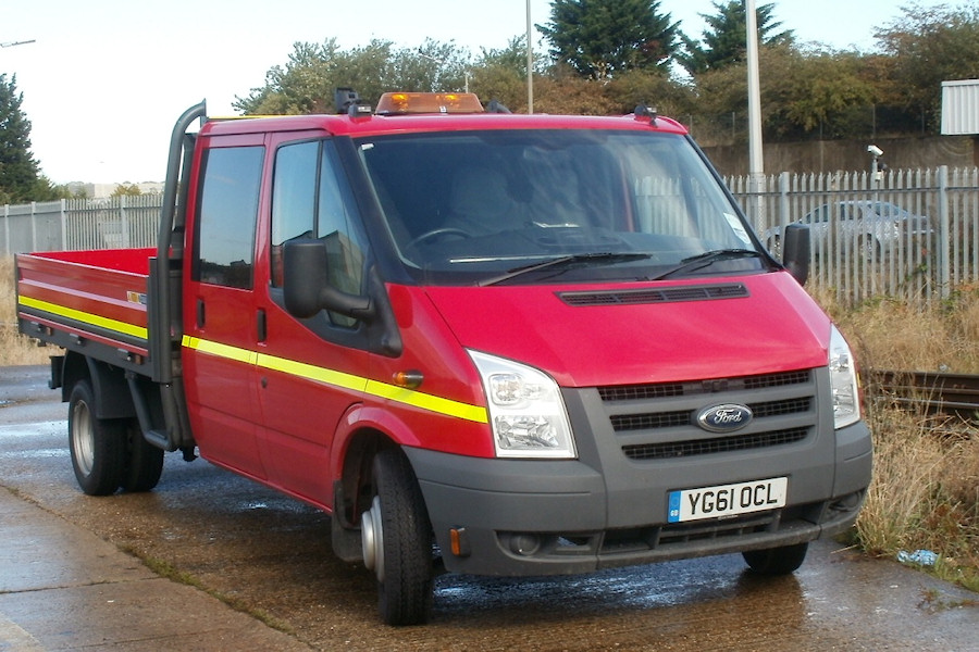 Details: This photograph may provide an answer to a recent puzzle, although it may not. Earlier this year I published photos of two unmarked red vans that had turned up with First London (VK59GWW and VK59GWZ) and I wondered whether they had transferred from other First operations. Robin's photograph was taken at Cricklewood railway depot and shows Bedford-based Ford Transit dropside truck YG61OCL in a very similar livery. He has also sent a photo of Transit crew van YH11ZO in the same colours. First Capital Connect operates the former Thameslink and Great Northern railway networks, while First also has various other railway franchises (although not the West Coast Mainline!). It does seem odd however that the road support vehicles do not carry the purple-based livery used on the rail rolling stock. |