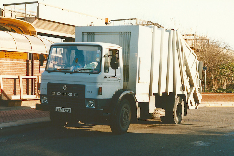 Details: I recently published a photograph of Dodge Commando dustcart 2421D when it was newly delivered. This view, taken at Heathrow Airport Central on 26th November 1986 highlights a few changes made to the vehicle. As already noted, the lorry initially had wrong fleetnumbers (2420D), applied on the front only. It seems the same numbers were later applied in the normal position on the front corners. However, the incorrect digits had been removed, with a replacement '1' applied only on the nearside of the front. Another visible difference is the solid front of the bodywork, although this may be just the back of the compactor plate at its rearmost position. Finally four extra hydraulic lines had been added on the offside front of the bodywork. These are thought to be related to the lifting gear visible in the next photo. |