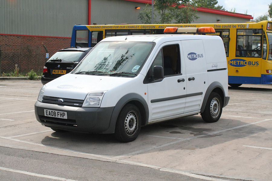 Details: Ford Transit Connect van EA08FHP has been with Metrobus since new in summer 2008. It has fleetnumber 9024, applied at the top of the windscreen, and is based at Crawley Garage, where it was photographed on 23rd August 2012. In the background are the two remaining Marshall-bodied Dennis Darts used as training buses. New to City of Oxford in 1995, eight were transferred to Metrobus between 2001 and 2003. Note the lettering above the side windows, in particular that Croydon appears in a different font (non-italicised). This was to replace the mention of the now-closed Godstone garage, that name still being carried on the second of the buses. |