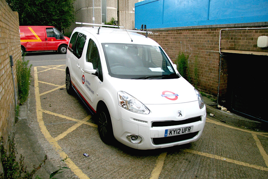 Details: As has been seen, the yard at Wakering Road (Barking) is a bit tight for the four cars that are allocated there. On 19th July 2012 7450P (one of the Peugeot Partner cars delivered the month before) was parked on the ramp to the adjoining (and dis-used) covered car park. For reference, the yard itself is behind the wall on the left, while the station is behind the photographer. This angle shows the rather functional roof bars fitted, these having what appear to be sliding mini-bolsters. |
