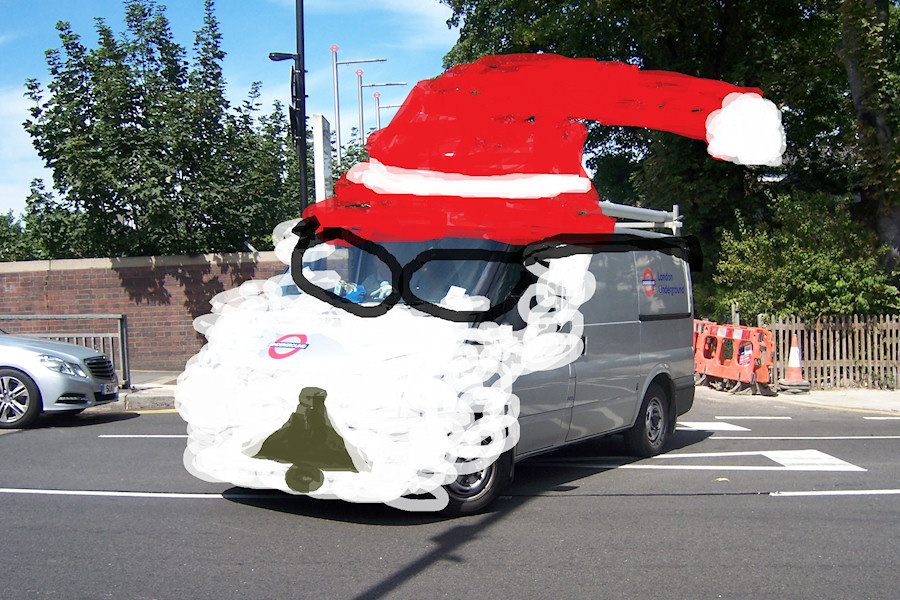 Details: This rather charming picture was sent in by Ray last year, just too late for publication before Christmas. I am no expert in digital imaging but I suspect that this one may have been somewhat re-touched. Underneath is Ford Transit van 6845F, coming out of Museum Way at Acton Town. |