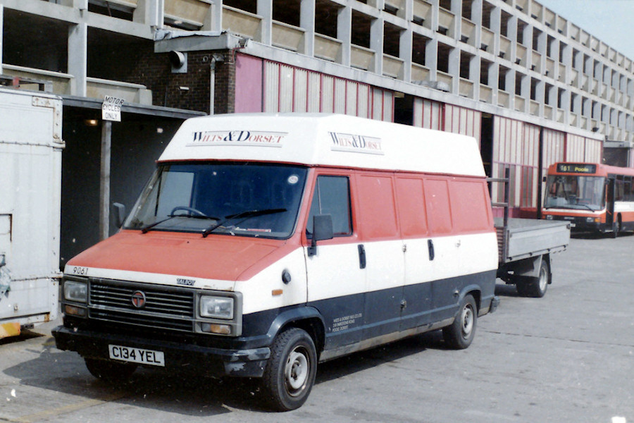 Details: Back to Poole again, and the first Talbot service vehicle to be illustrated on this website. C134YEL was a Talbot Express van new in 1986 and given fleetnumber 9061 by Wilts and Dorset. As can be seen, it carried a variation of the red, black and white livery worn by their buses. Note the curious arrangement of doors, with a pair of hinged doors in the middle of the nearside. Photographed on 21st April 1996. |