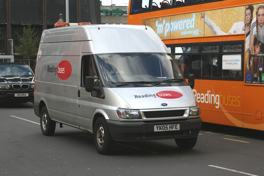 Details: Reading Buses abandoned the long-standing cream and maroon livery some time ago in favour of various bright 'modern' colour schemes. An orange variant is seen on the bus in the background of this shot taken on 27th September 2012. Main subject however is Ford Transit YK05HFE, a Mk6 long-wheelbase, high-roof van in a fairly plain silver livery. |
