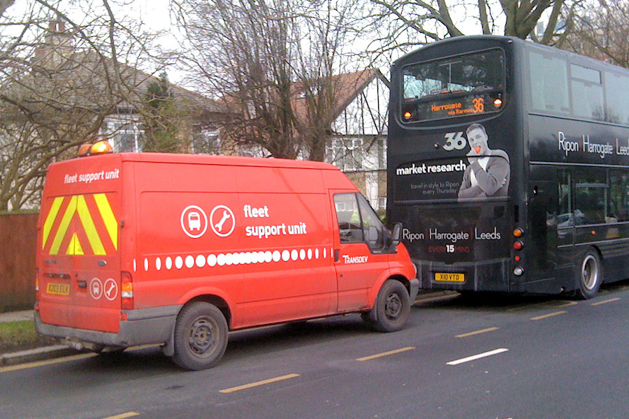 Details: Our Yorkshire correspondent recently sent in this photograph taken in Alwoodley, Leeds on 12th February 2013. The subject is Ford Transit van X203ELK of Transdev's Harrogate operation, seen attending to a Wright-bodied double-decker. It was only when preparing this photo for publication that I realised the van had once been a London area service vehicle. It served with London Sovereign (which later became part of Transdev) between 2001 and about 2007. |