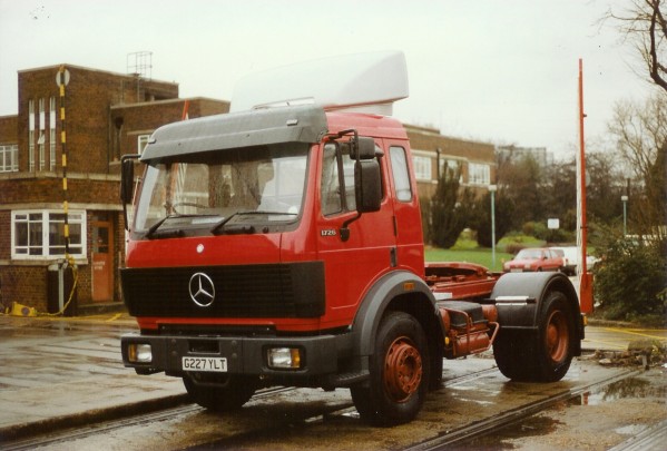 Details: Mercedes-Benz 1726 articulated unit 2474M (G227YLT) arrived in February 1990 in this non-standard red livery but was soon repainted into the new white/blue livery. Photographed on the 28th of that month at Acton Works, the vehicle later lost the roof-mounted air-dam, although the sun visor was retained (see picture). The cab is extended to allow the fitting of a bunk behind the driving seat. Compare to the standard Mercedes-Benz SK cab. |
