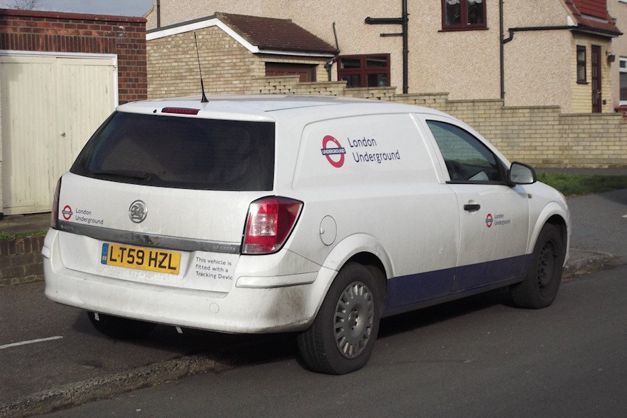Details: Vauxhall Astra van 6831V is unusual (but not unique) for carrying London Underground markings on standard livery but without the red stripe. New in November 2009, it operated in unmarked white/blue for about 2 years. As this photograph taken in Elm Park on 3rd March 2013 shows, it has still not gained fleetnumbers. |
