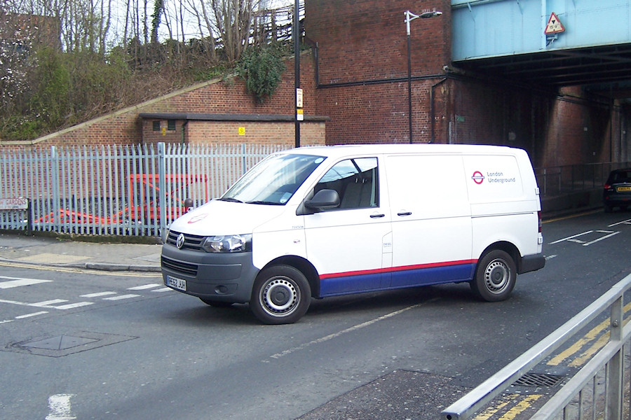 Details: The Volkswagen Transporter van is similar in size to a Ford Transit. LBSL Infrastructure have a definite preference for the type, while a small number are regularly added to the LUL/JNP fleets. 7593VW is a short-wheelbase low-roof example operated by LUL from Hainault Depot. It was photographed passing the station there on 18th March 2013. |