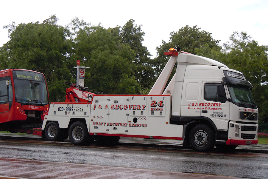 Details: KX03AHF is a Volvo recovery truck used by J & A Recovery, slightly larger than Sovereign's similarly registered KX03ABF. On 1st July 2012 AHF was photographed at Tolworth with London United Enviro 200 SDE3 on tow. |