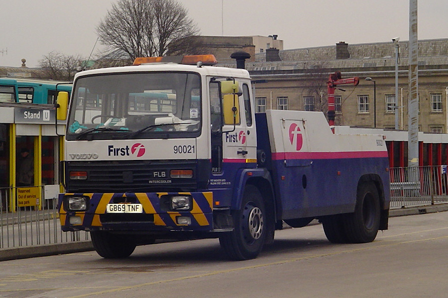 Details: First Manchester Volvo FL6 towing lorry G869TNF is similar to previously illustrated G712TVU and has a consecutive fleetnumber. The livery application is markedly different though. It was photographed at Bolton Bus Station on 19th March 2013. First has a national numbering system for its buses and service vehicles, the latter being in the 9xxxx range. This does not seem to apply to their London-based service vehicles though. |