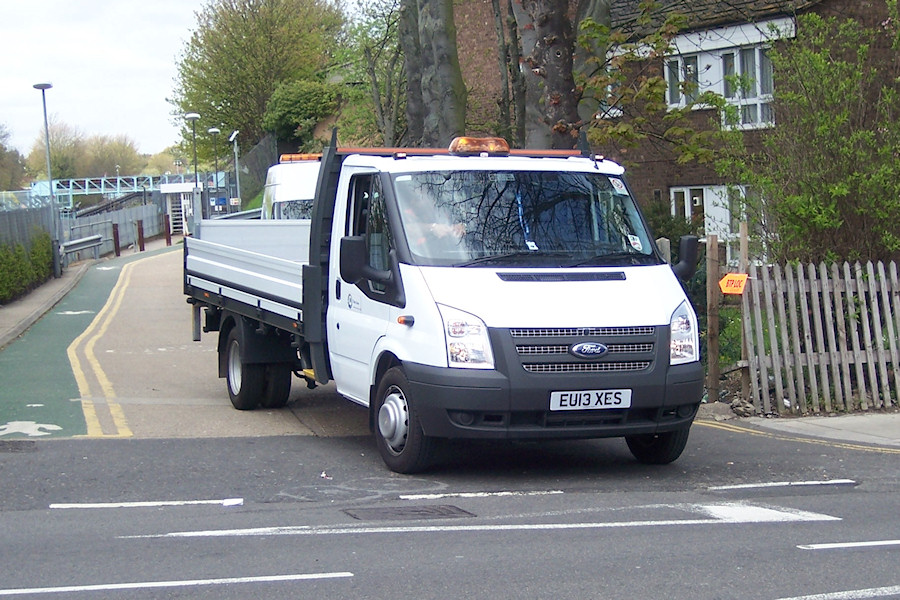 Details: Supporting my earlier speculation that the Tube Lines livery is no longer being applied, no 13-reg SVs have yet been reported carrying it. However, the brand was to be seen on labels applied to Ford Transit dropside truck EU13XES, photographed leaving Museum Way at Acton Town on 29th April 2013. Given the non-standard registration series, this vehicle is presumably a short-time hire or loan. Note the reduced-height tail-lift platform, perhaps a fold-over type to aid rearward vision. |
